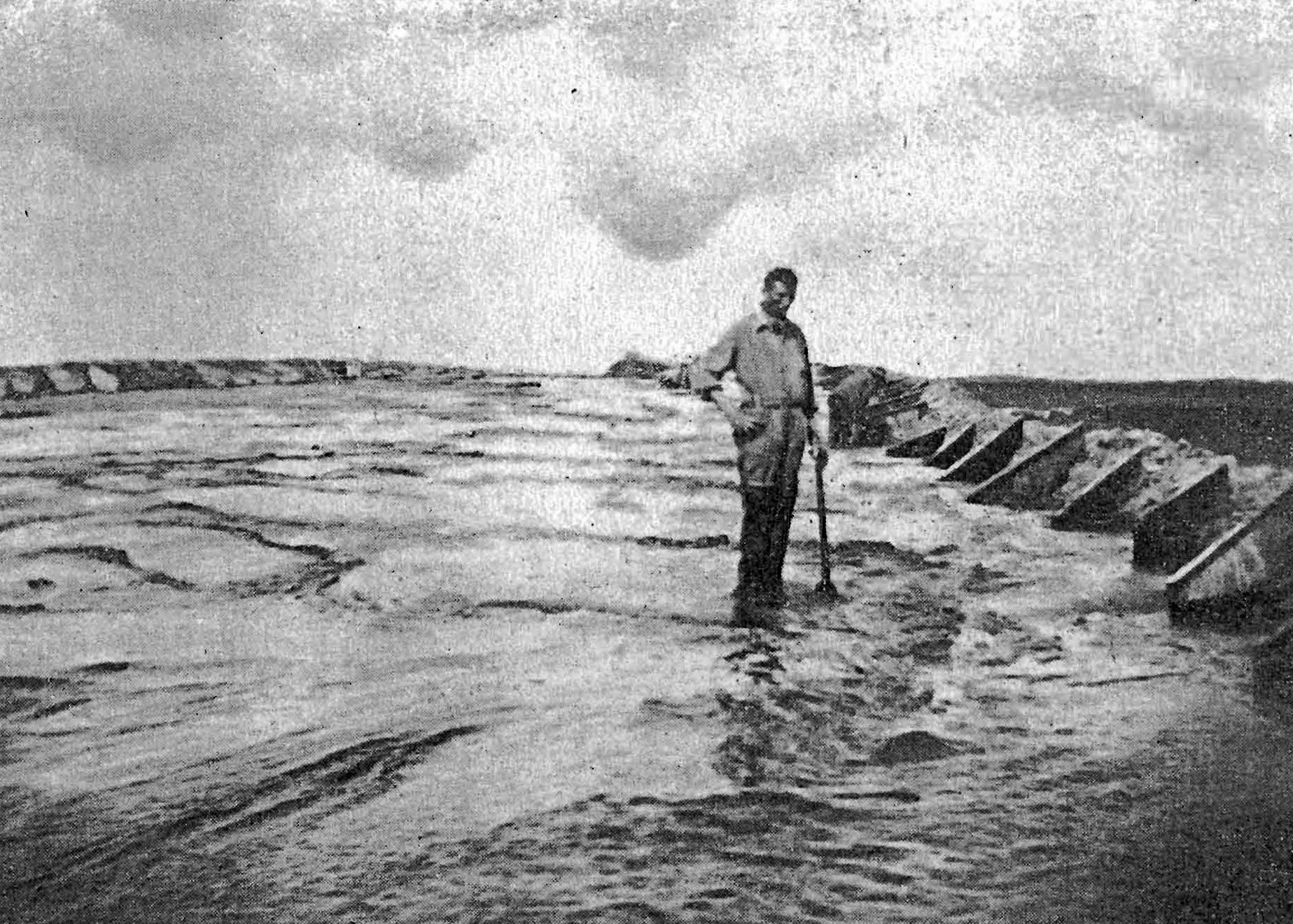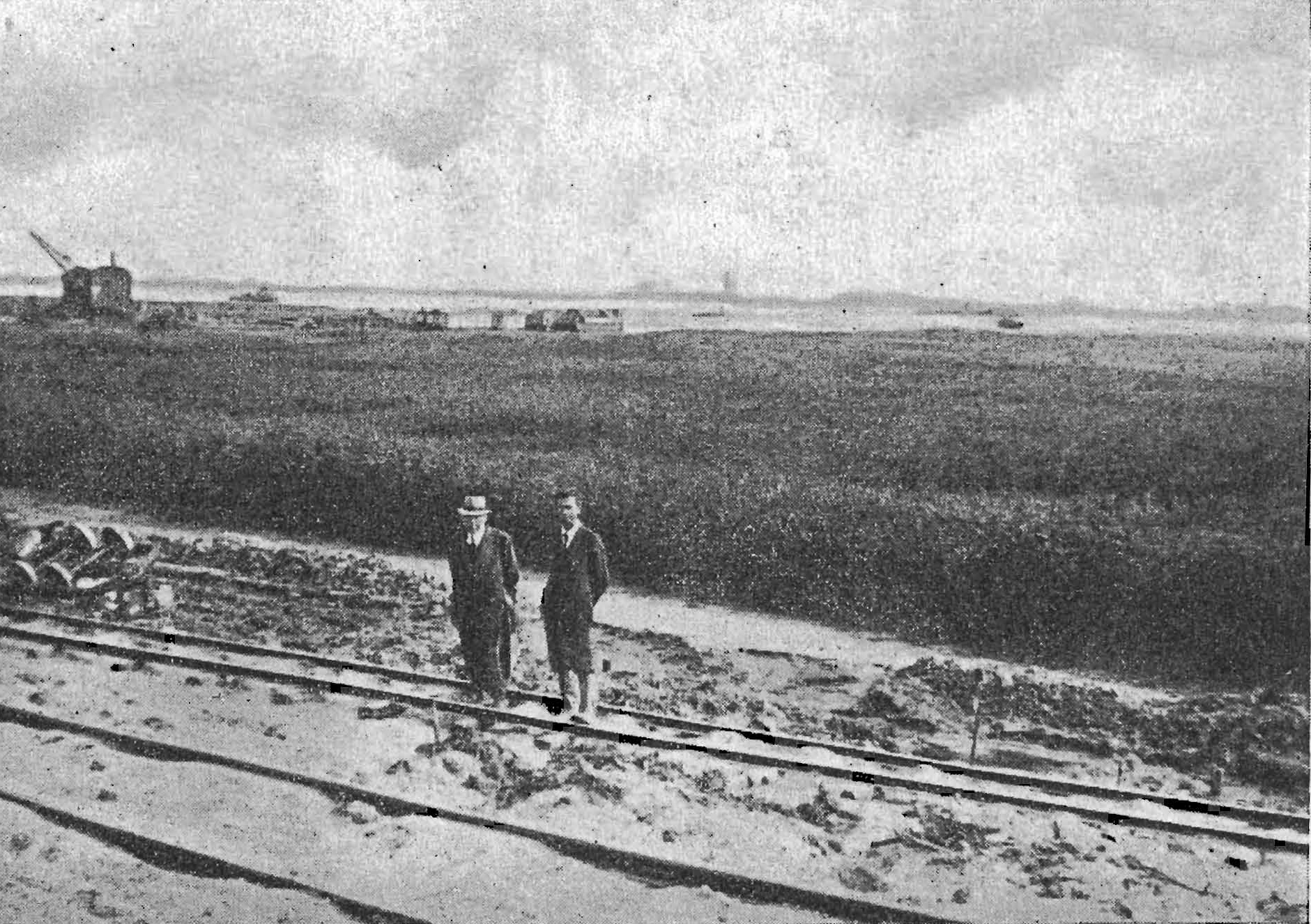Voorbereidende werkzaamheden voor de aanleg van de zuidelijke dijk bij de inpoldering van het Rietgors. Op de achtergrond de Brielsche Maas. Wie de heren op de foto zijn, is niet bekend. Misschien de kwade geniussen Bakker en van Van Beek? Foto uit het artikel van Verhoeven.