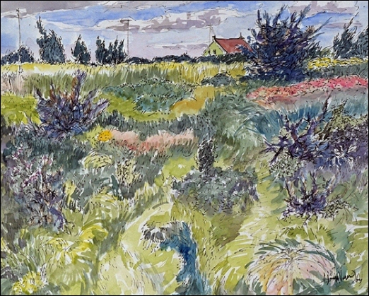 1 = Zuidzijde van het natuurreservaat De Beer, met op de achtergrond opzichterswoning, aquarel, 1964