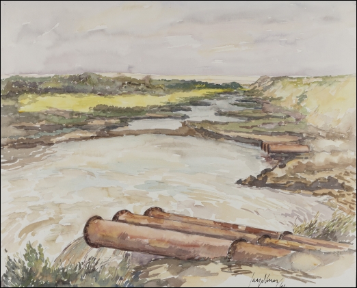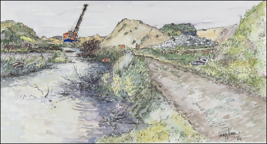 4 = Opspuitingen op het laatste stukje terrein van "De Beer" dat tot haven wordt gegraven, gezien in de richting van de zee, aquarel. 1964