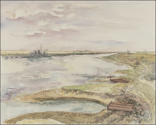 7 = Havens graven in Europoort op het terrein van het voormalige natuurreservaat "De Beer" gezien naar het noorden. Links de nieuwe zeedijk voor de grote buitenhaven; daarachter schepen op de Nieuwe Waterweg, aquarel, 1964