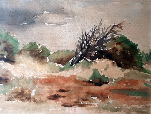Vooral het rode 'mos' vond ik prachtig en de dramatisch verwaaide struik, half begraven door een zandheuveltje. Nu, zoveel jaar later, zou ik de takken verfijnder willen maken, maar mijn penseel was misschien te dik? Jan heeft de aquarel later in laten lijsten en hij had het altijd ergens in zijn huis, later flat, hangen. Nu ik de aquarel weer terugzie is de herinnering aan die dag weer helder geworden.